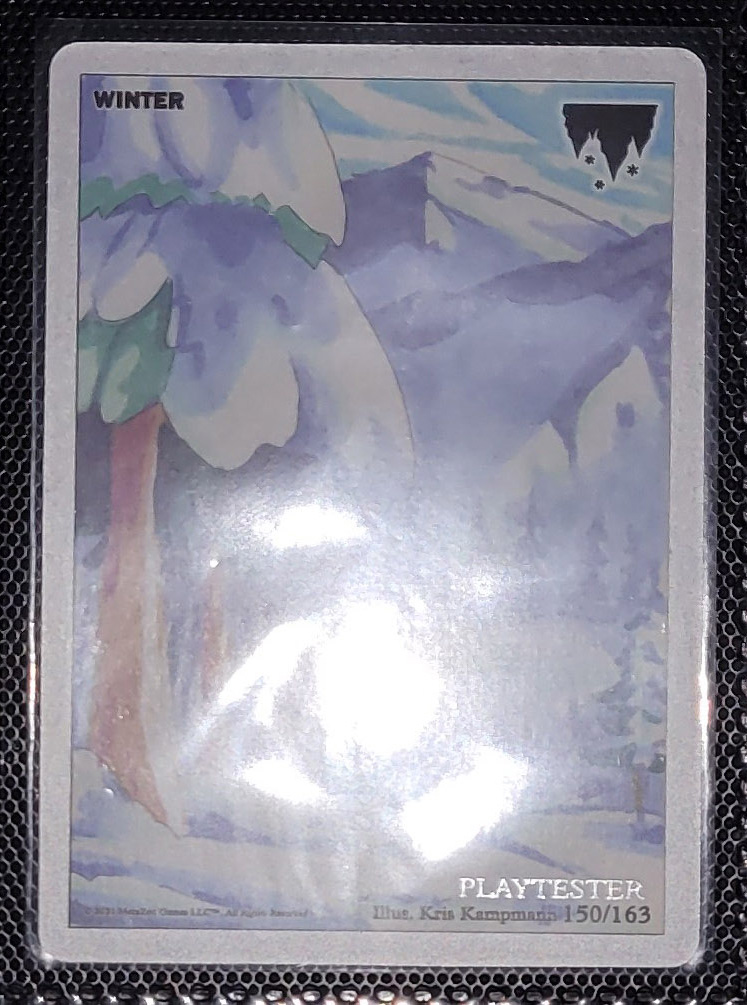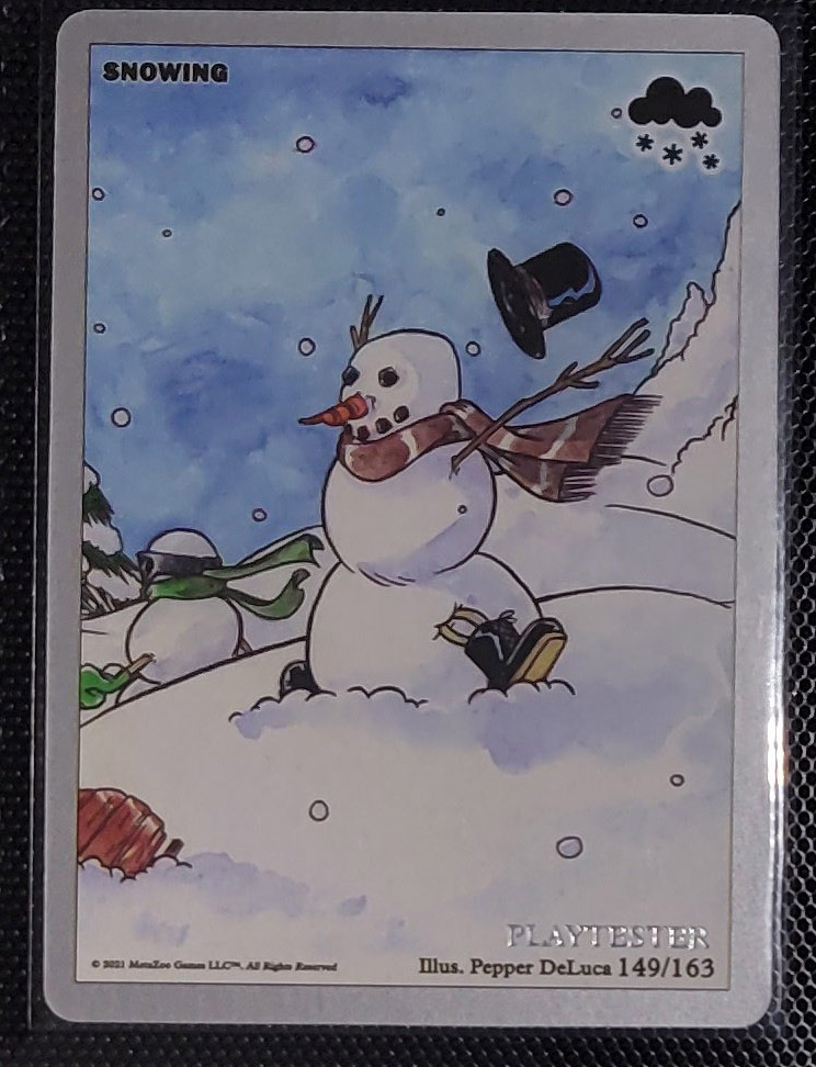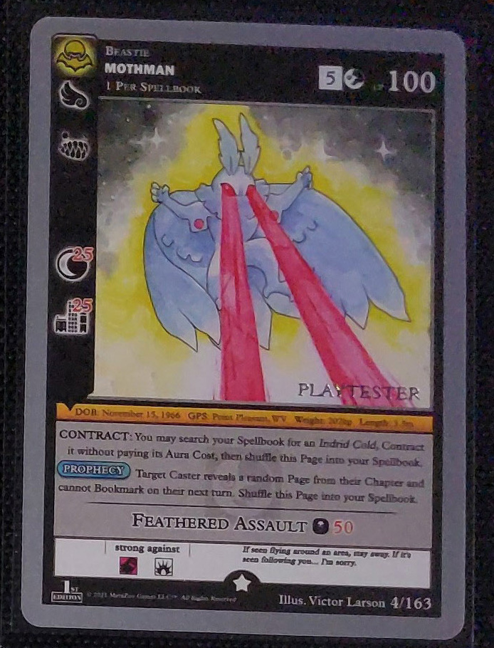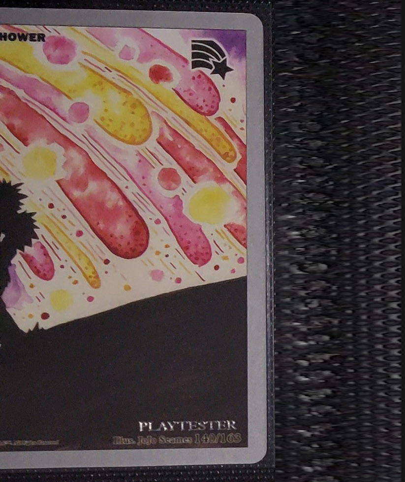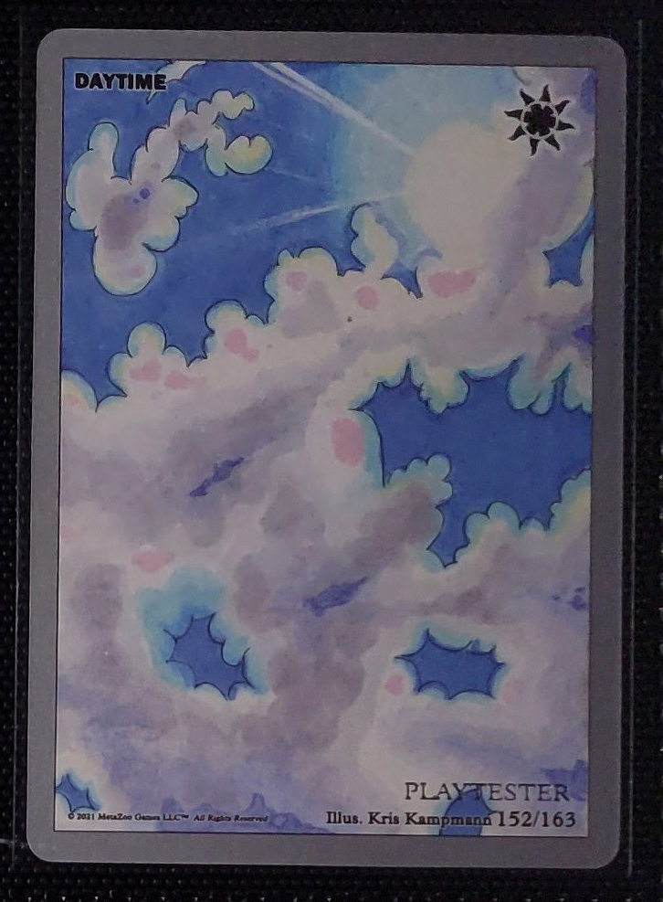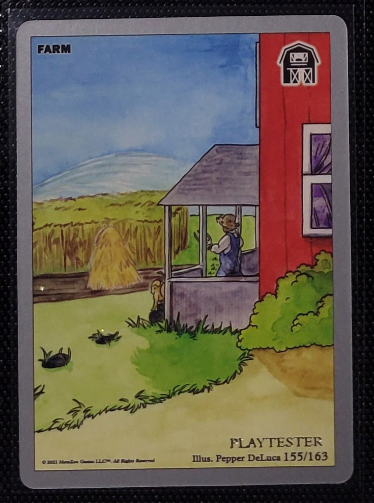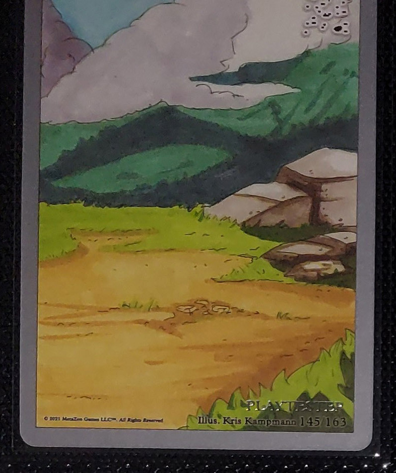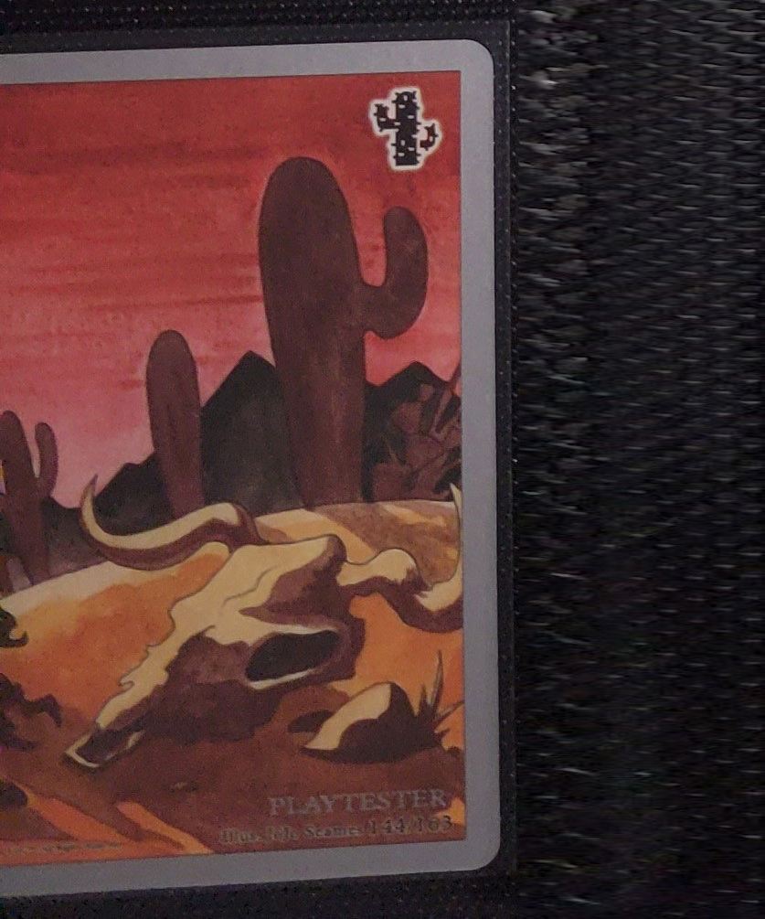 - Playtester cards also have a glistening silver ‘PLAYTESTER’ stamp on the bottom-right of each illustration window.