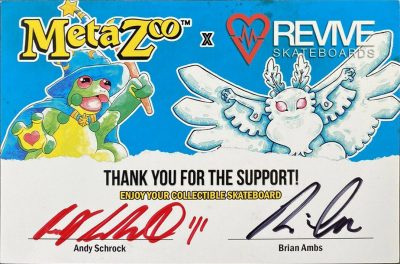 The Revive mini promo set had a total print run of 2,000 boxes. Each box comes with a serialized redemption card that allows you to redeem a MetaZoo-themed Revive Skateboards board. There are a total of 10 different cards in the mini set. Each box comes with two sealed cards.