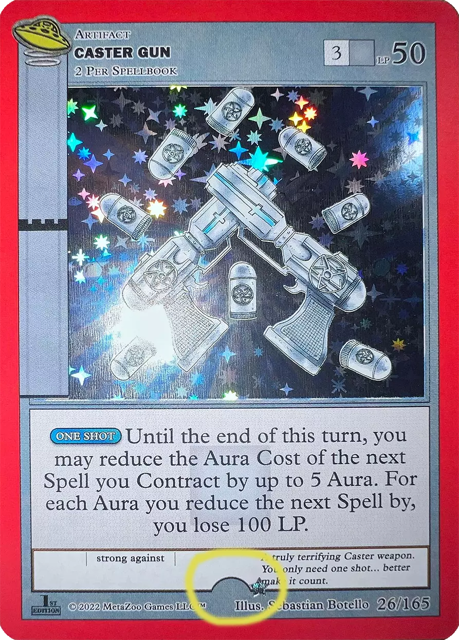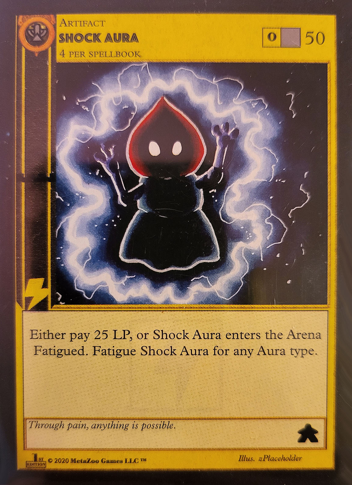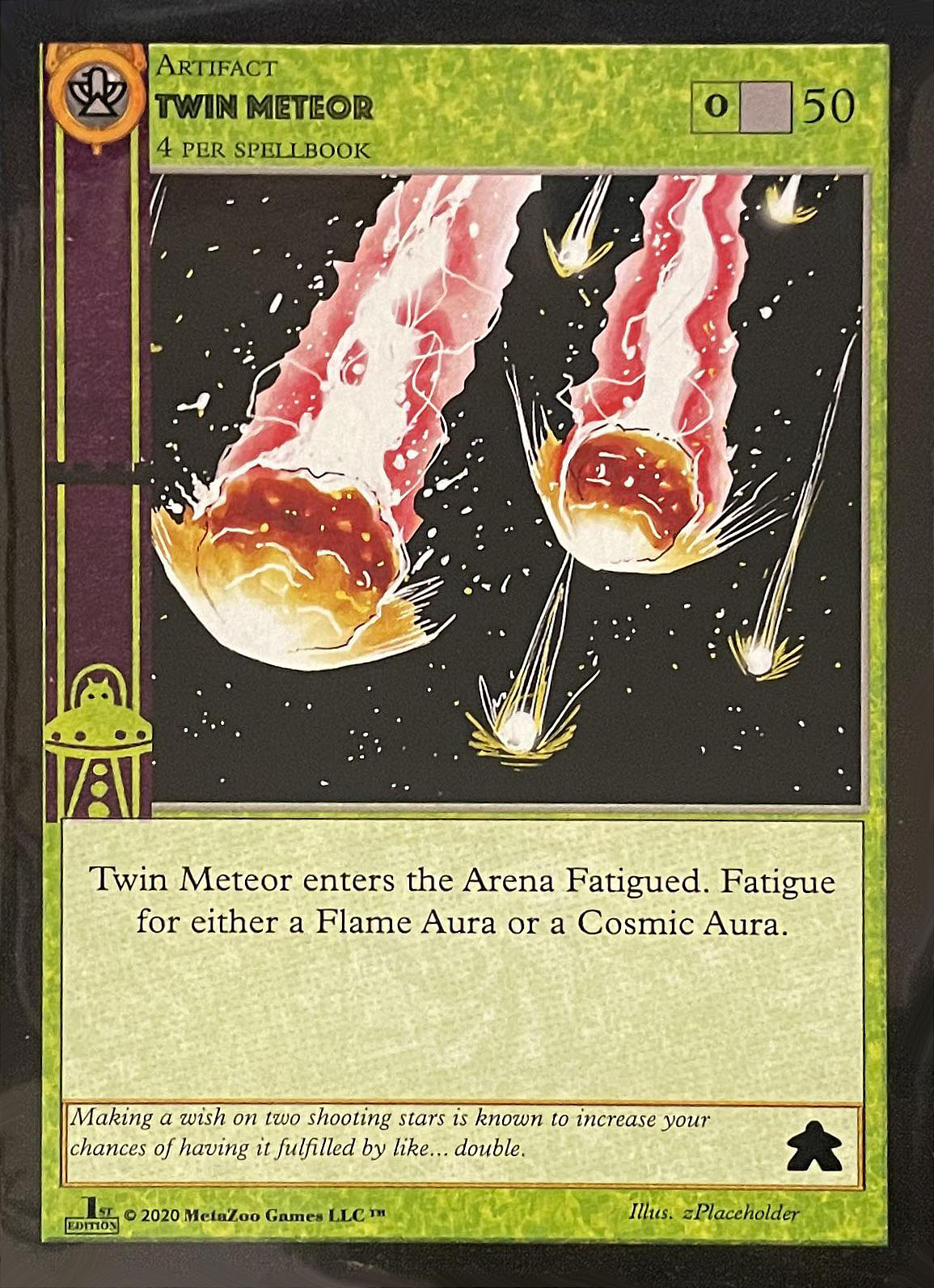- The illustrator’s name didn’t make it onto the Twin Meteor & Shock Aura sample cards, and remained as the placeholder text while being edited. Notice the “Illus. zPlaceholder” on the bottom-right.