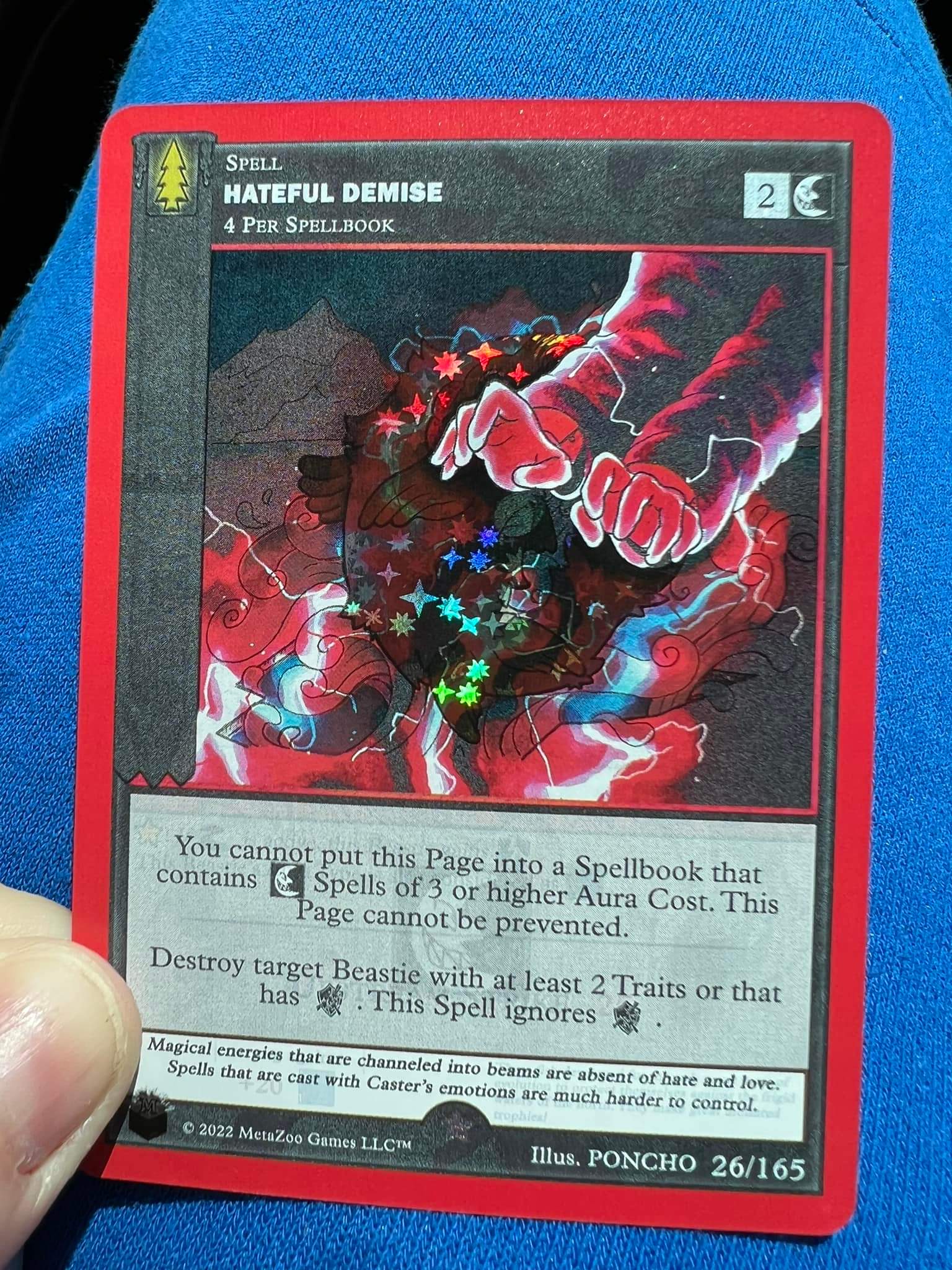 - The holofoil on this card can be seen throughout the entirety of the card, as if a layer of ink has been skipped in the printing process. It is the equivalent of a reverse holo and a full holo combined, and then some. Holo bleed does show up on many MetaZoo cards, however it is never even remotely this prominent.
