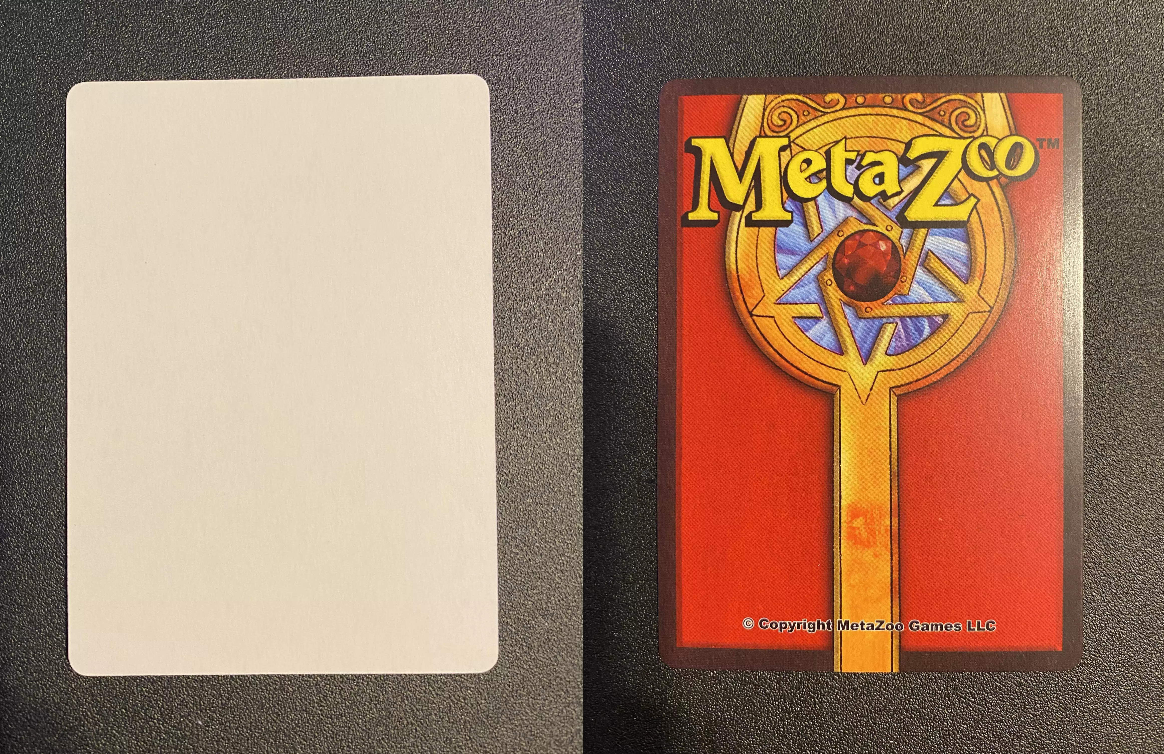 - The front of this MetaZoo card is entirely blank. The one above was opened from a UFO Spellbook, but blank cards exactly like this one have been found, very rarely, in MetaZoo booster packs since Cryptid Nation: Base Set.