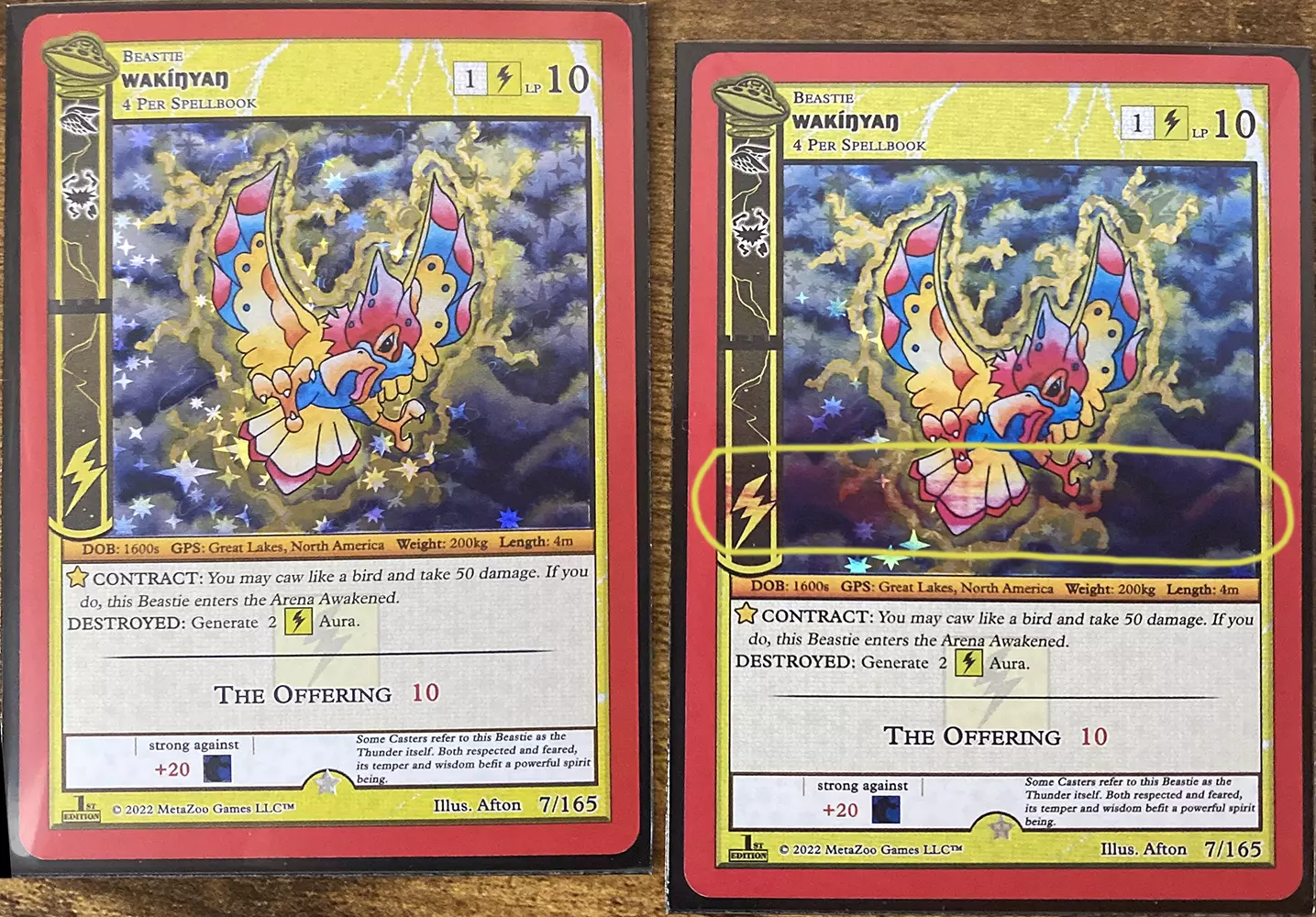 - An error in printing has caused the red ink to smudge across a large number of Wakinyan cards in Cryptid Nation: UFO; but not all of them. (Left represents true colors, right has ink smudge encircled in yellow). There are other examples of ink smudges occurring in past MetaZoo releases as well.