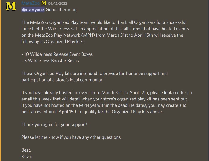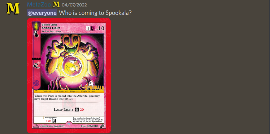 A few things we have learned are that they will have promo packs for attendees of Collect-a-Con, Staff, and Players. These packs will contain full holo and stamped cards of previous common, uncommon, and rare cards from Cryptid Nation, Nightfall. They will also include a play MetaZoo Network logo on the bottom. This alone, I think, will build lots of excitement for people who are just attending, staffing, and playing in the tournament.